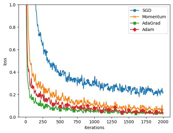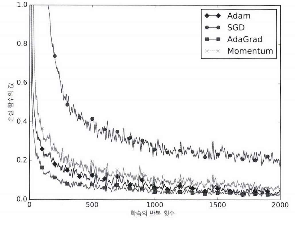 - 나머지 세 기법의 진도는 비슷, AdaGrad가 제일 빠름