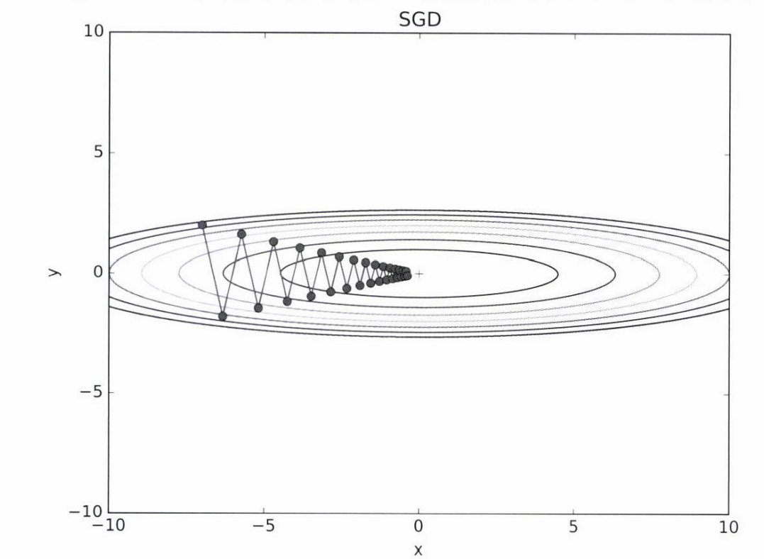 - 현재 장소에서 기울어진 방향을 따라서 이동하는데, 현재 위치에서 기울어진 방향이 global minimum의 방향과 차이가 날 수 있어서 지그재그를 그리면서 비효율적인 경로를 따라 움직임 (비등방성 함수)