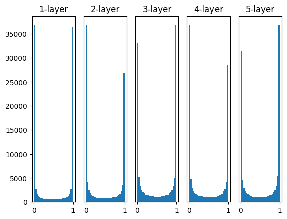 - 각 층의 활성화값 분포를 히스토그램으로 그림