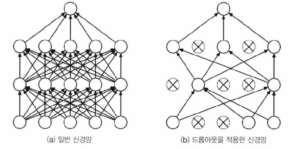 - 드롭아웃 : 학습 때 뉴런을 무작위로 삭제하는 행위를 매번 다른 모델을 학습시키는 것으로 해석