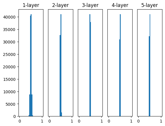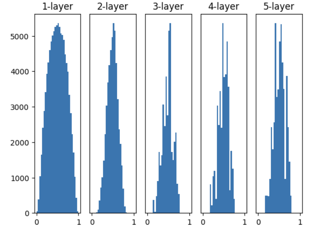 - 활성화 함수로 시그모이드 함수를 사용하는 5층 신경망에 무작위로 생성한 입력 데이터 흘림