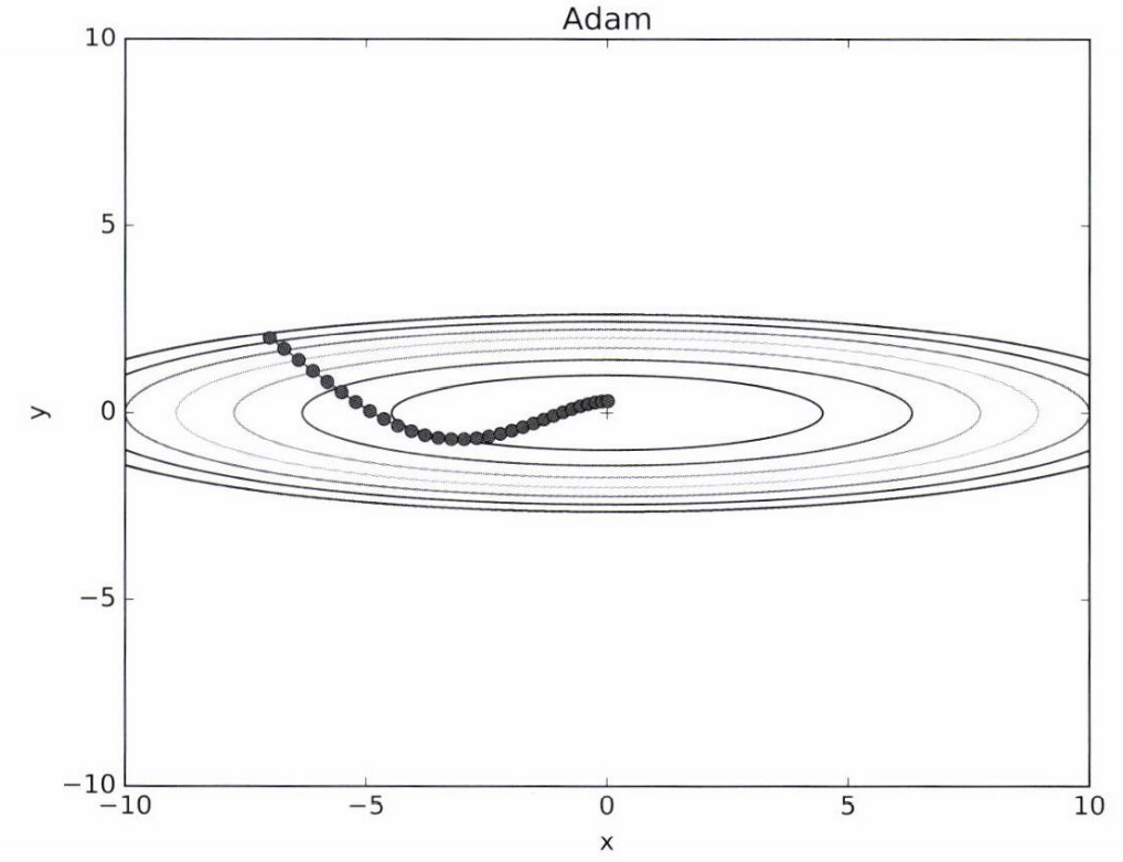 - x축은 일정한 방향으로 가속하고 y축의 방향 속도는 일정하지 않아서 x축으로 빠르게 다가감 -> SGD보다 효율적