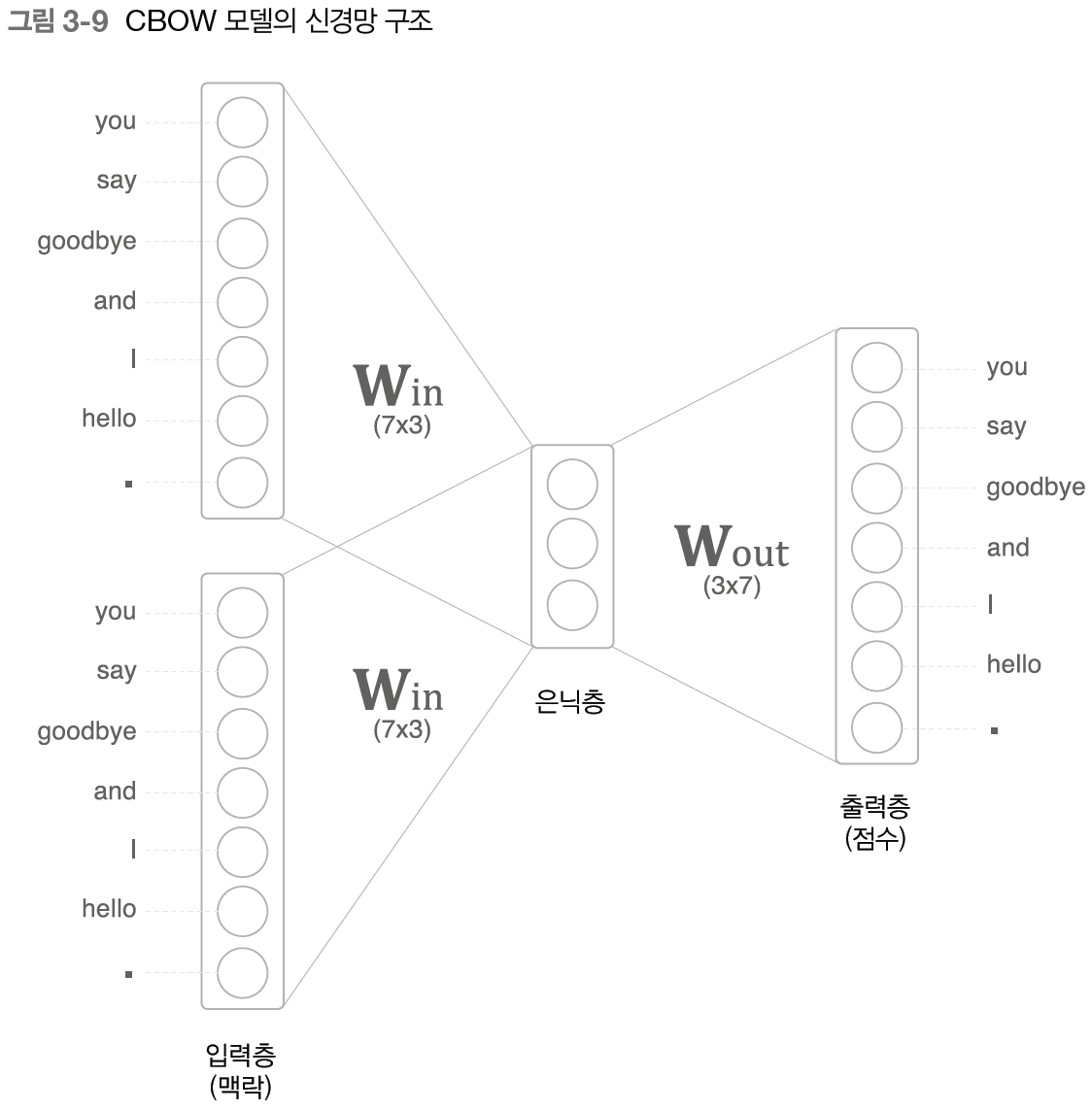 CBOW 모델 : 맥락으로부터 타깃을 추측하는 용도의 신경망