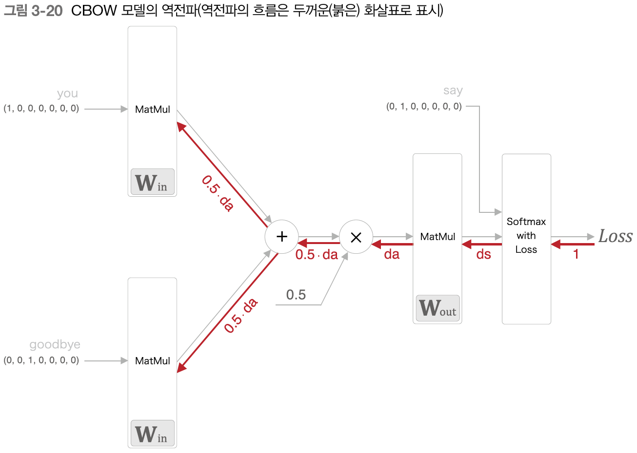 - 추론 기반 기법에서는 신경망을 이용해 미니배치로 학습 -> 학습 샘플씩 반복해서 학습하며 가중치 갱신