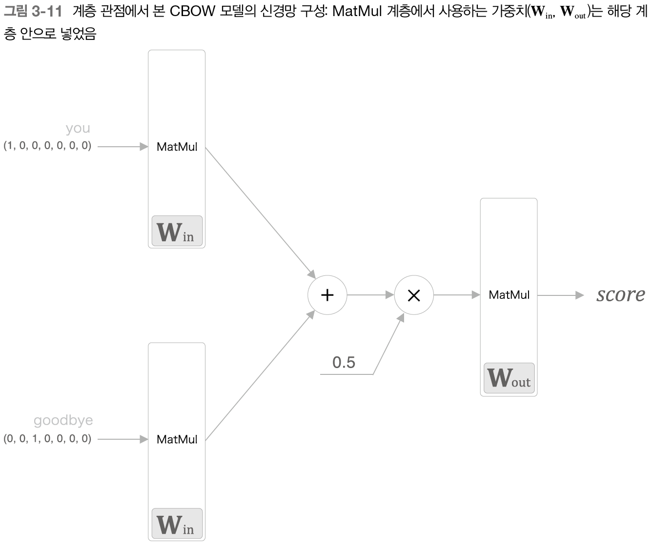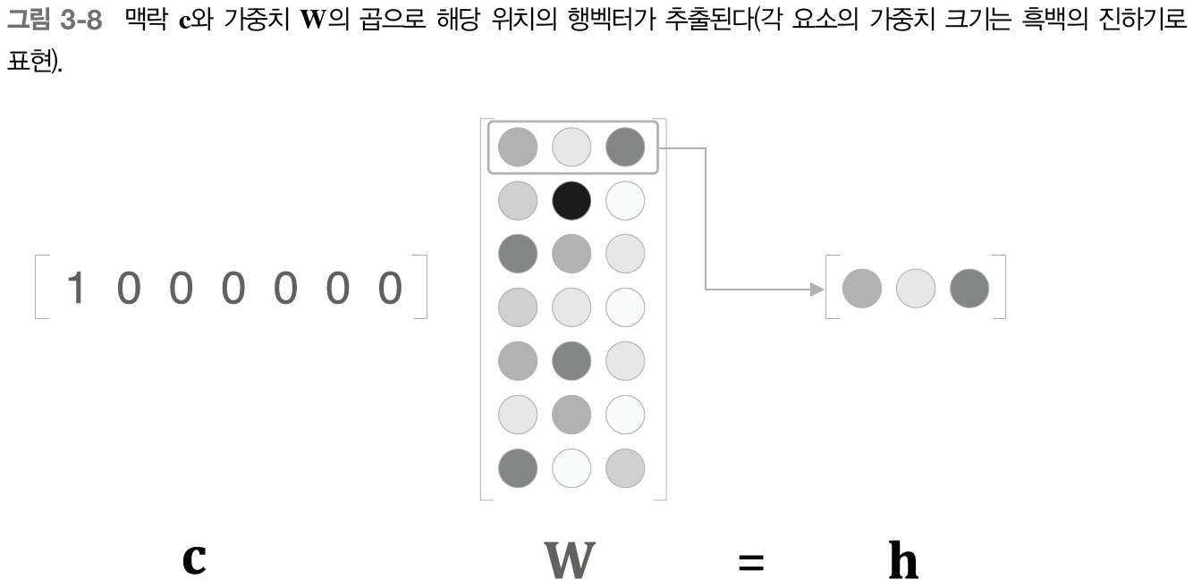 - c와 W의 행렬 곱 부분에서 c는 원핫 표현이기 때문에 행렬 곱은 결국 가중치의 행벡터 하나를 뽑아낸 것과 같음