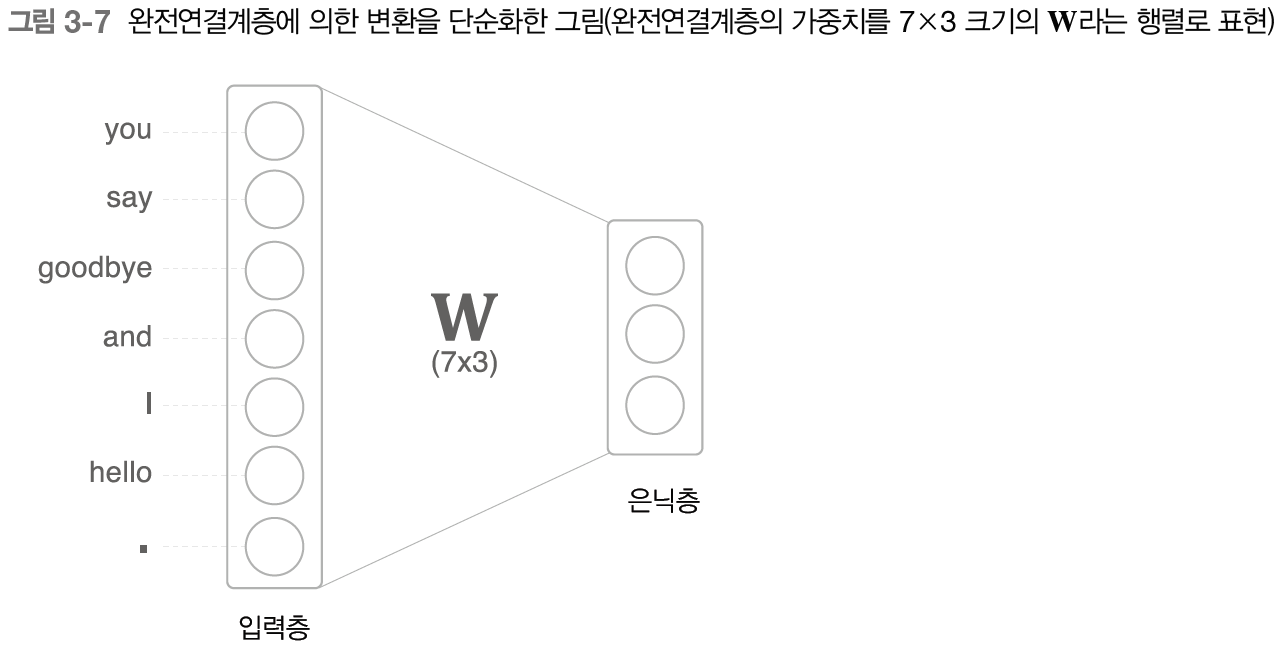 - 단어ID가 0인 단어를 원핫표현으로 표현한 다음 완전연결계층 통과시켜 변환
