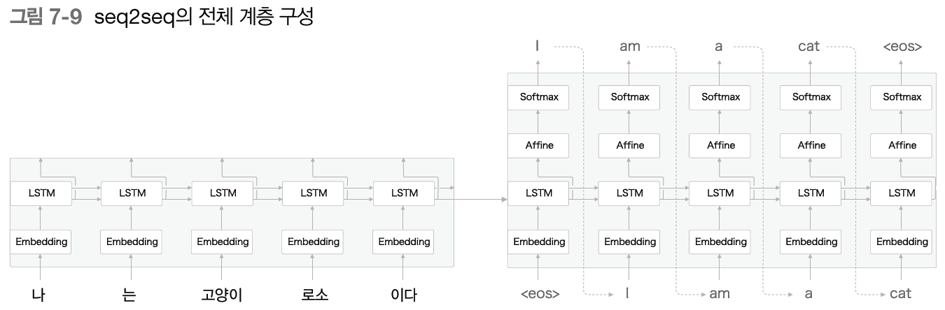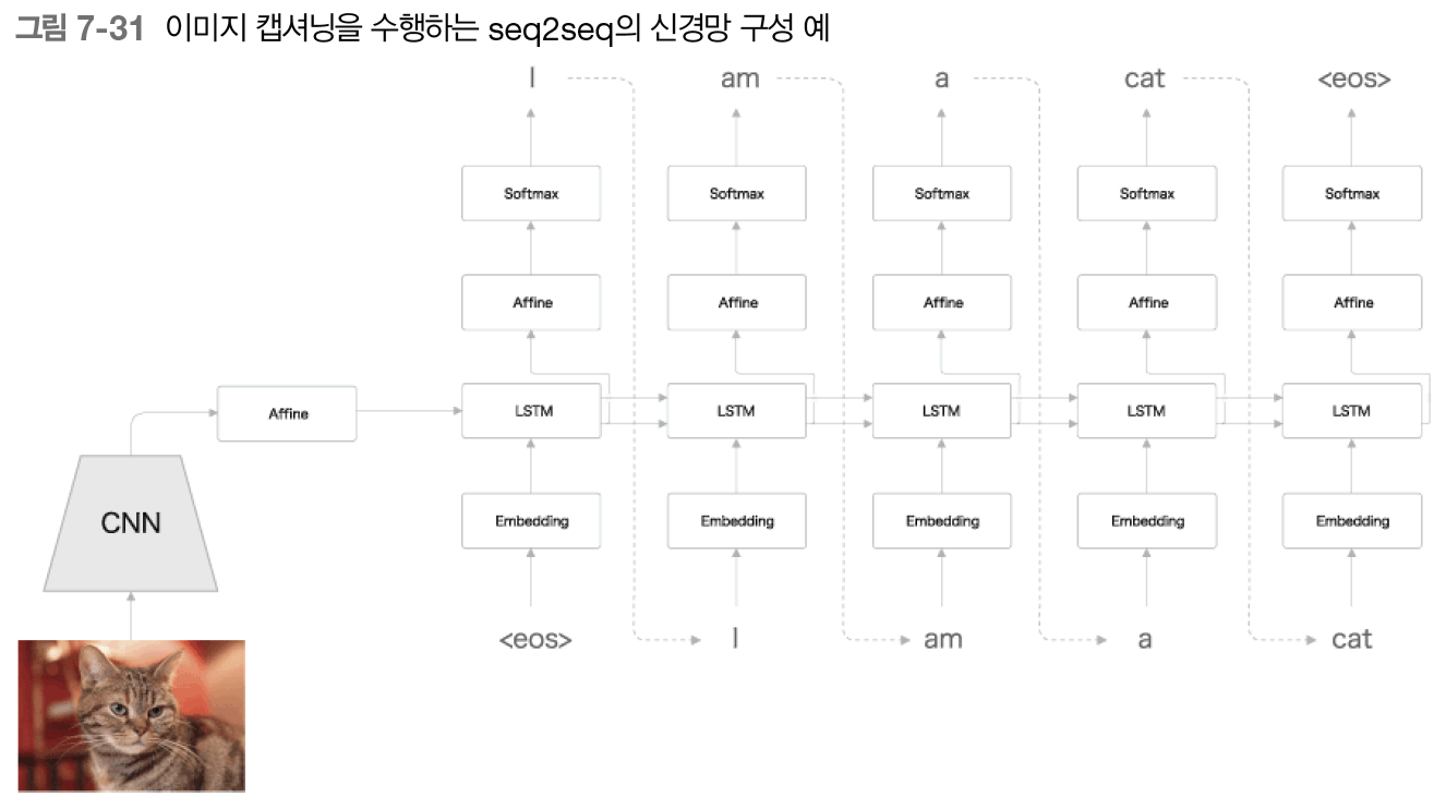 - Affine계층과 LSTM계층에 입력되는 벡터 2개가 됨 -> 실제로는 두 벡터가 연결 concatenate