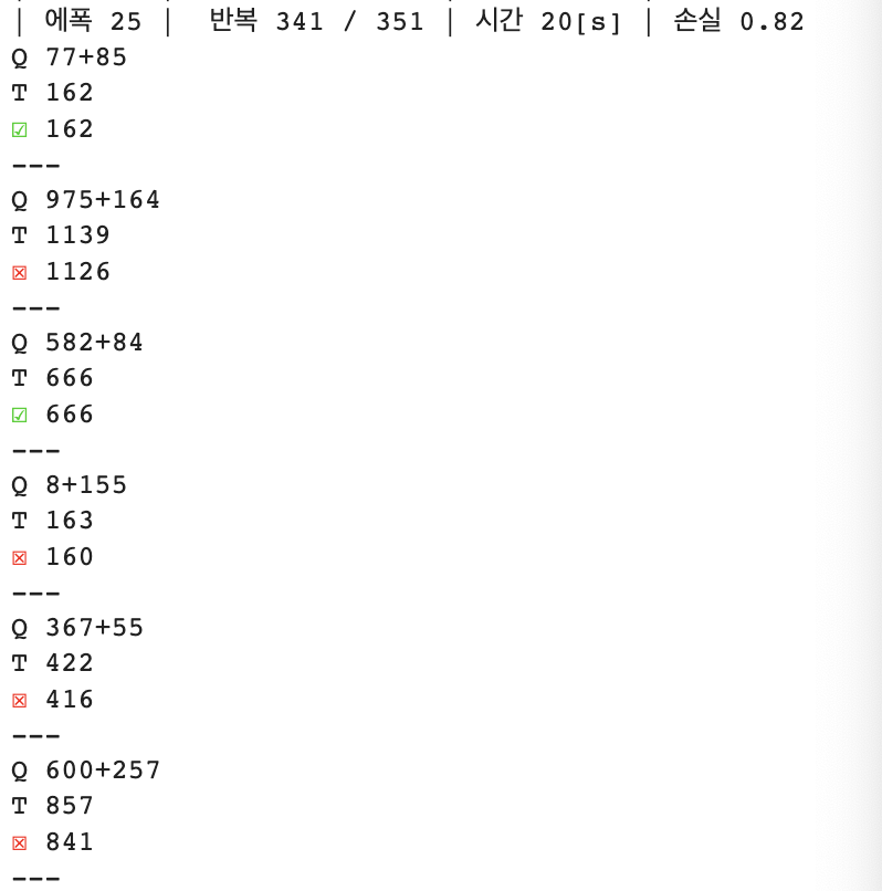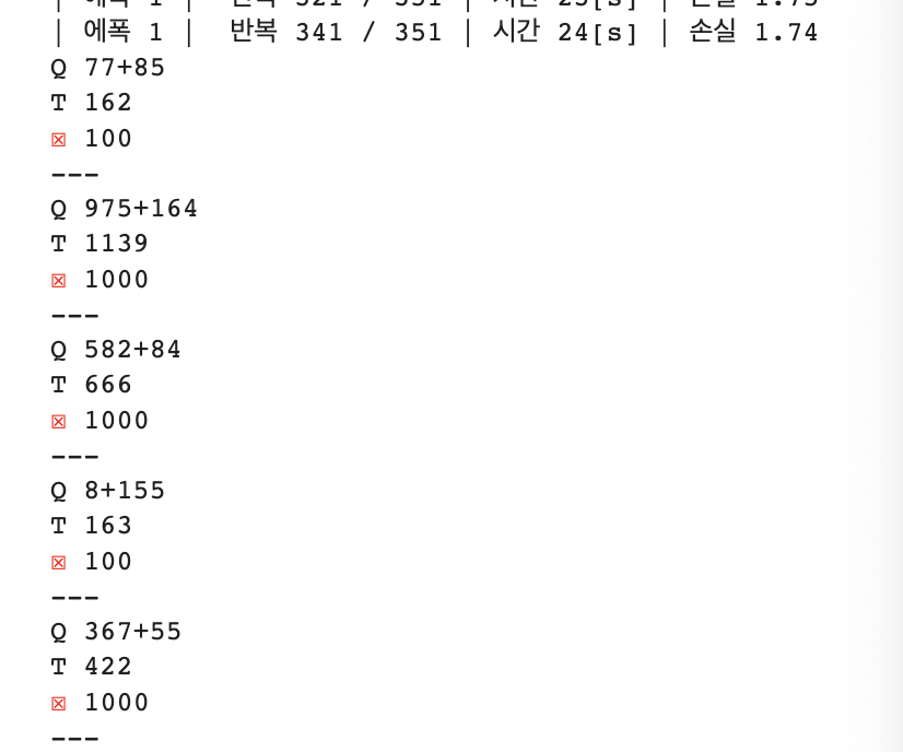 #eval_seq2seq함수의 인수 1)moder, 2)question(문제문장) 3)correct_id(정답) 4)id_to_char(문자ID와 문자의 변환 수행)