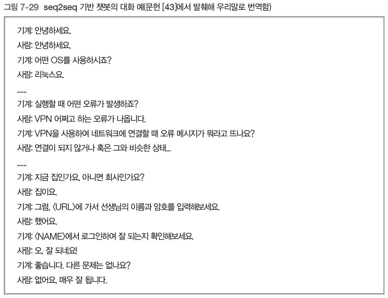 - 기계번역, 챗봇, 이미지 캡셔닝 등 seq2seq는 다양한 애플리케이션에 이용할 수 있다.