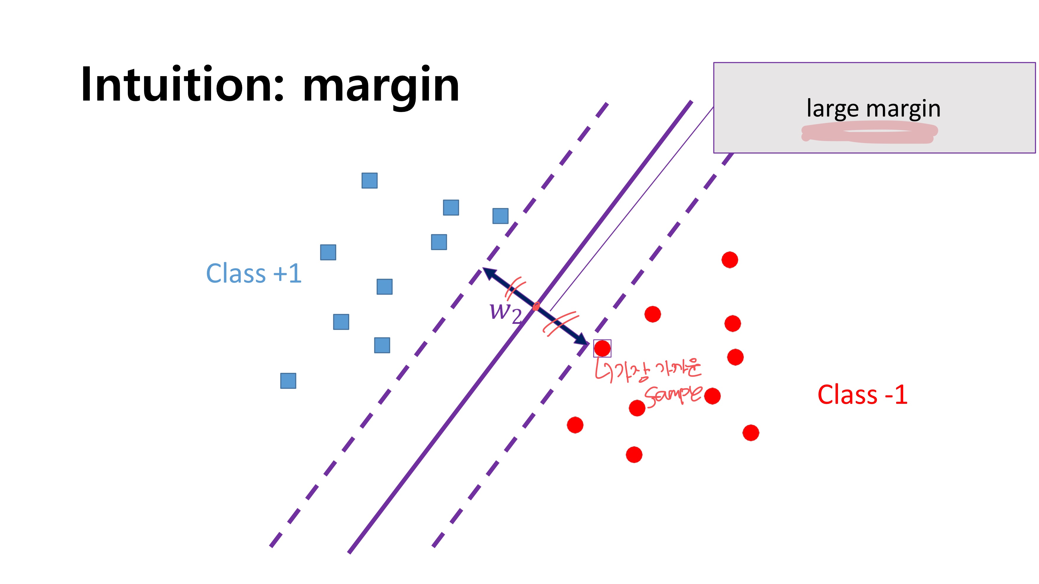 : 가장 큰 margin(가장 가까운 sample과 hyperplane사이의 거리)을 양쪽에 가지는 hyperplane을 고르는 방법