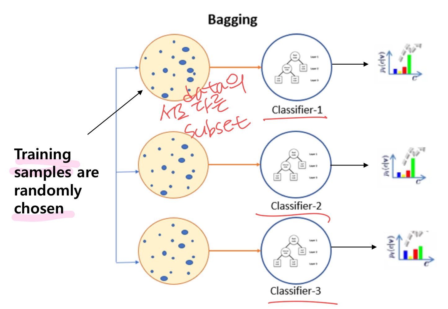 - By bagging -> random forest - 서로 다르게 학습한 decision tree
