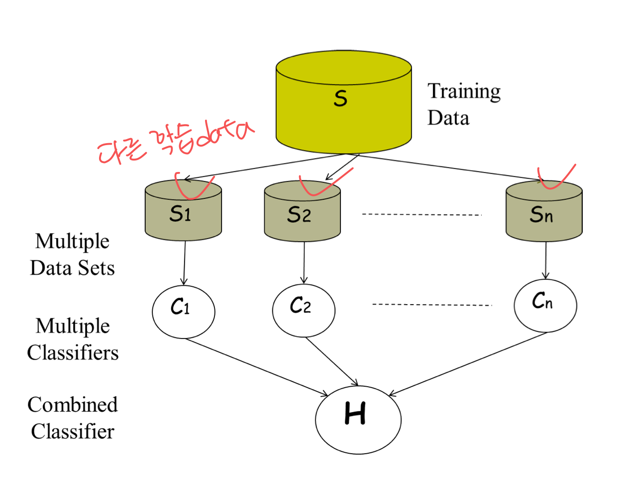 -> 머신러닝에서 알고리즘 종류에 상관없이 서로 다르거나, 같은 메커니즘으로 동작하는 다양한 머신러닝 모델을 묶어 함께 사용하는 방식