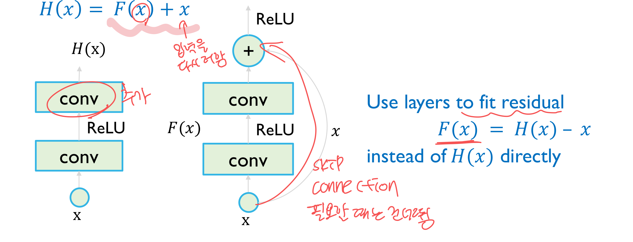 - 만드고 싶은 출력을 위해 입력 대비 얼마만큼을 더해 줄지 혹은 빼줄지 그 추가 값만을 layer에서 만들어줌