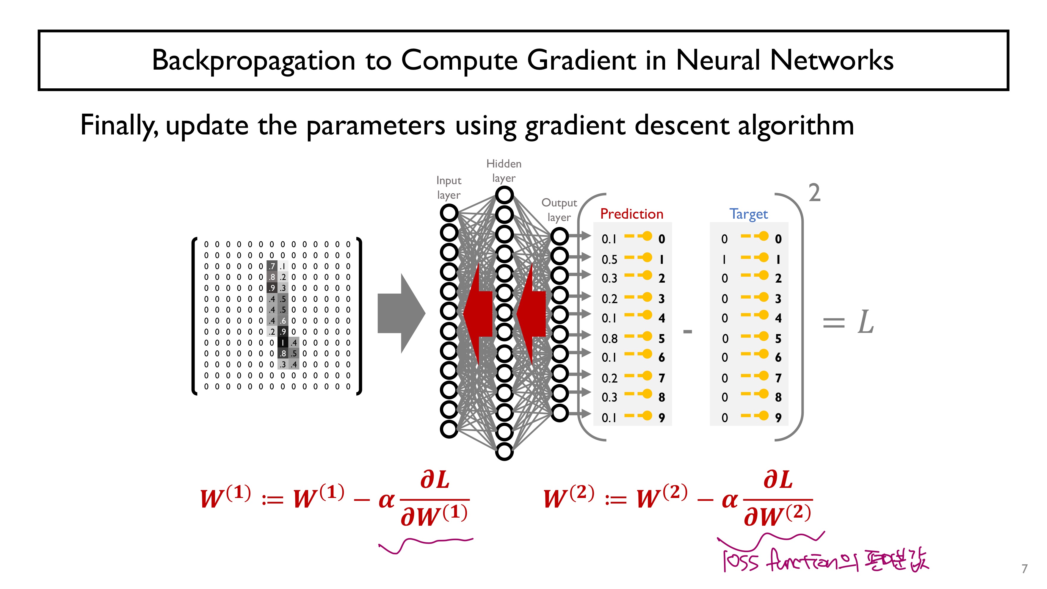 - 여기에 data item을 입력으로 줘서 forward propagation 계산 과정을 수행하고 최종적으로 loss 값을 계산