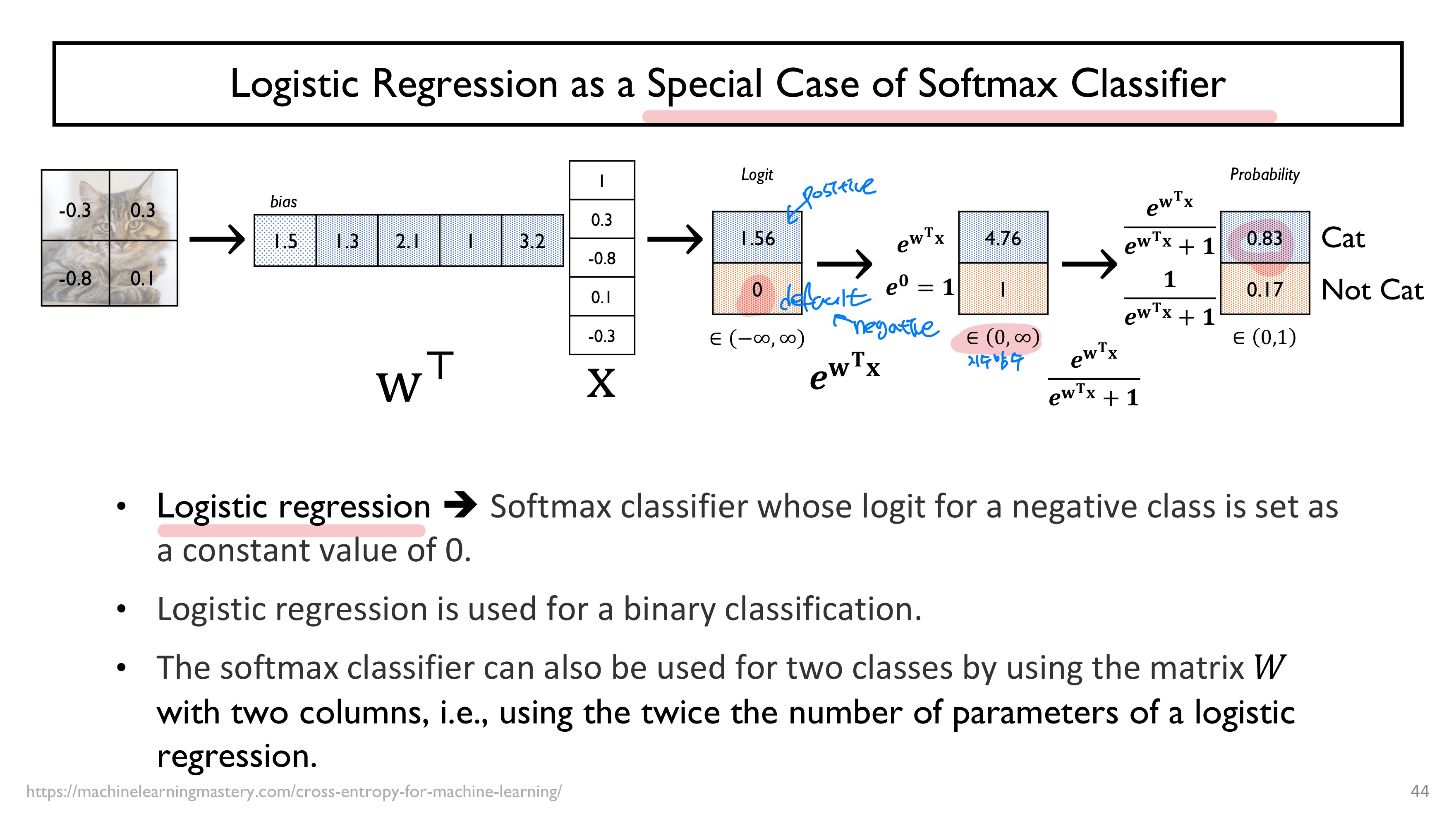 - Logistic Regression : negative class에 해당하는 가중치는 0으로 가정하고 이에 대한 가상의 확률 값을 구하고 positive class에 해당하는 가중치만을 학습을 통해 최적화된 값으로 도출해낸다.