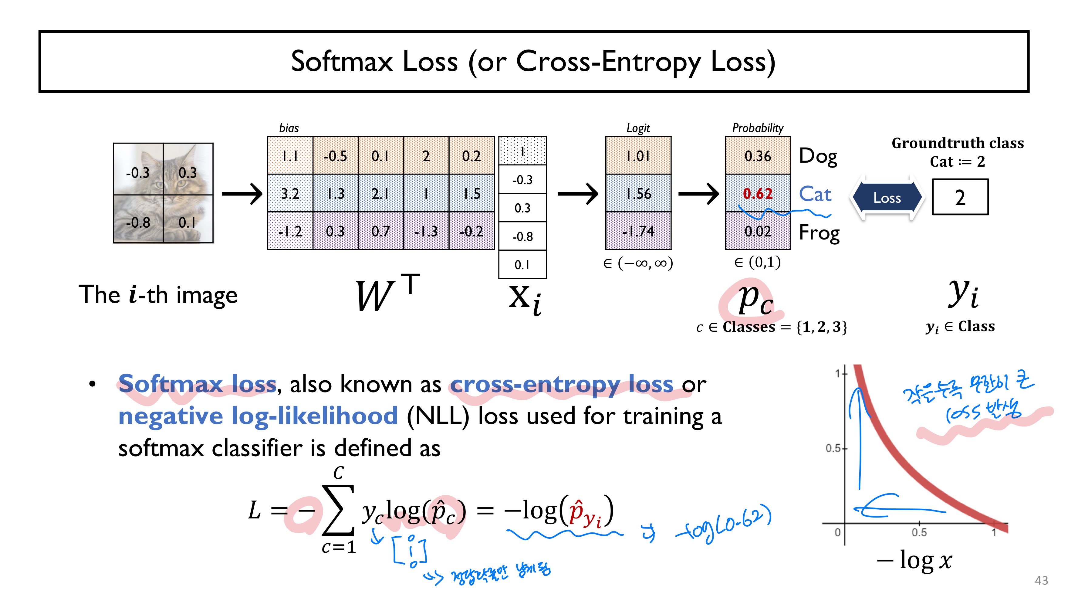 - softmax loss(cross-entropy loss, negative log-likelihood)
