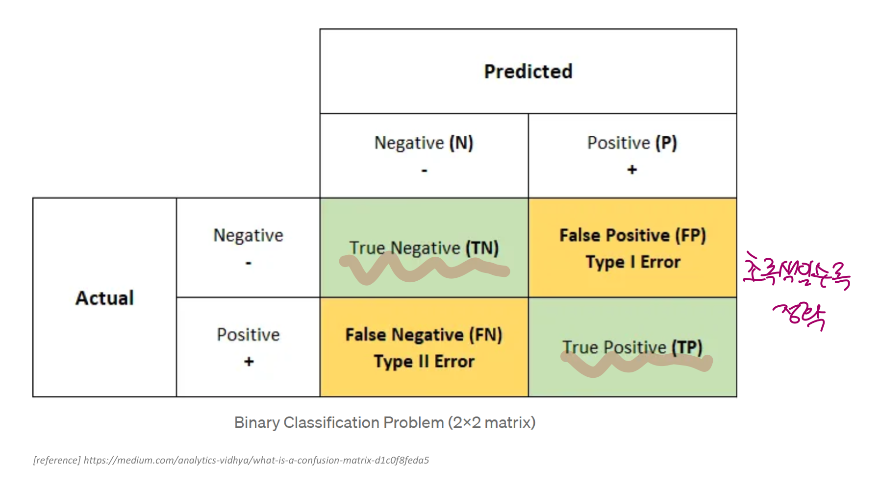 -> weight를 다르게 두어 평가할수도 있음 (고객예측 - FN cost 크게, Promotion - FP cost 크게)